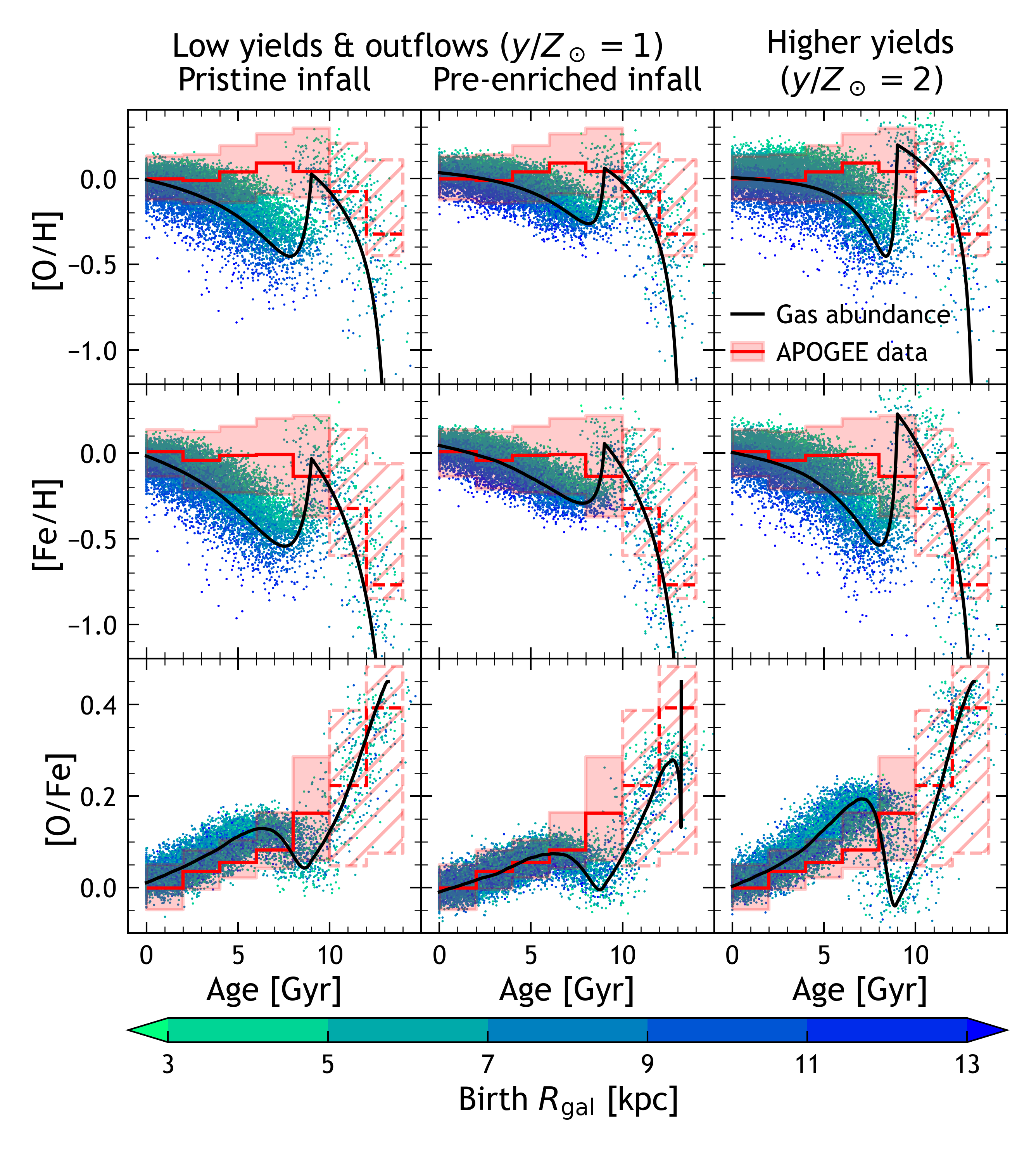 The above plot shows that the observed relationship between age and metallicity is largely flat for the past ~8 billion years. The two-infall scenario struggles to reproduce this flat relation, especially the model with low nucleosynthetic yields and Galactic outflows (left column). Pre-enriching the accreting gas to low metallicity (center), or increasing the yield scale (right), can mitigate but not completely solve the issue. We also find the model does not match the observed distribution of stellar ages in the Solar neighborhood.